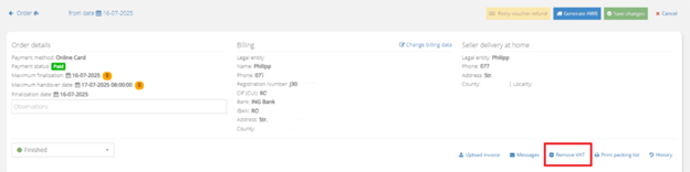 - Press the Edit button and if all the conditions are met you will see an active Remove VAT button, as in the image below: