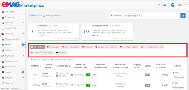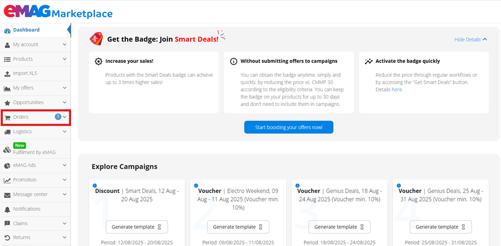 In order to see all the orders received on the eMAG platform, access the Orders menu, from Dashboard.