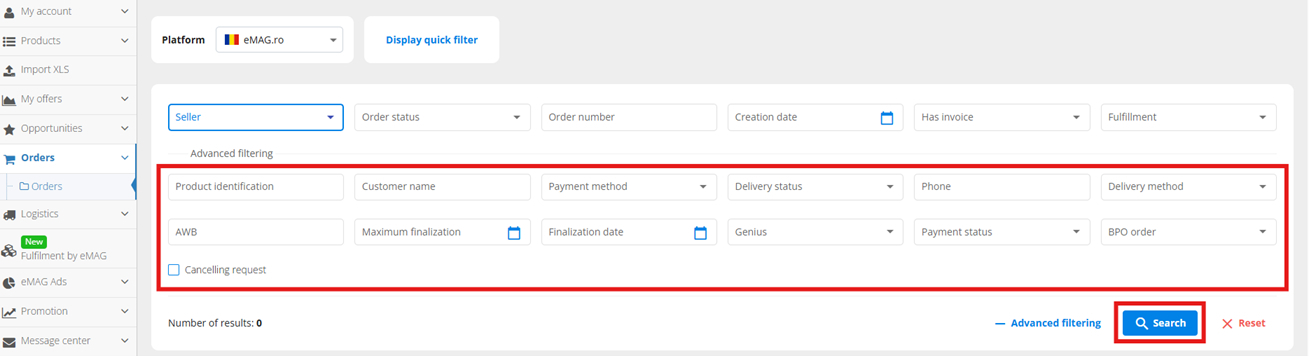 You can also use the Quick search button available on the top of the page which allows you to apply more filters at the same time. This allows you to search for orders by selecting the: