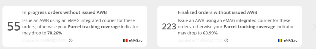 Displays orders finalized without AWB issued through the eMAG Marketplace platform. The widget also shows a prediction for the Parcel tracking coverage indicator. When clicking on the widget if filters all finalized orders without AWB from the first day of the current month until today.