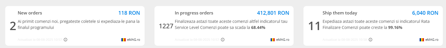 eMAG Marketplace interface has set of widgets which provides you with a facile view of your account state regarding the most important actions to be taken every day.