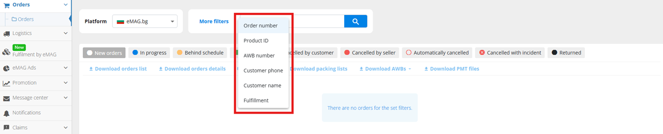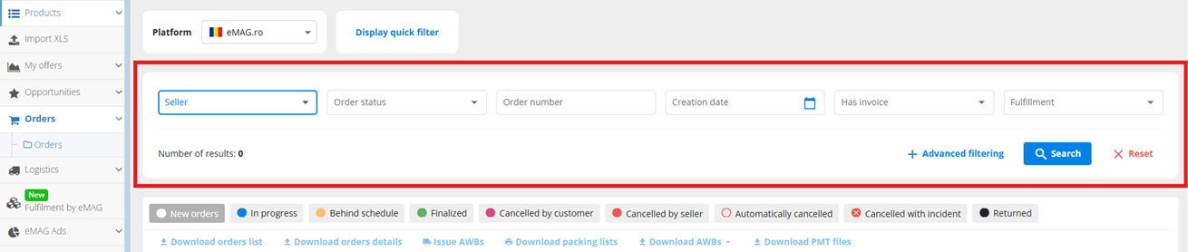 If you press the +Advanced filtering button, it will display all the available filters which can be used when you want to see only certain orders of your listing in a quick manner. Once you have selected the wanted filters, press Search.